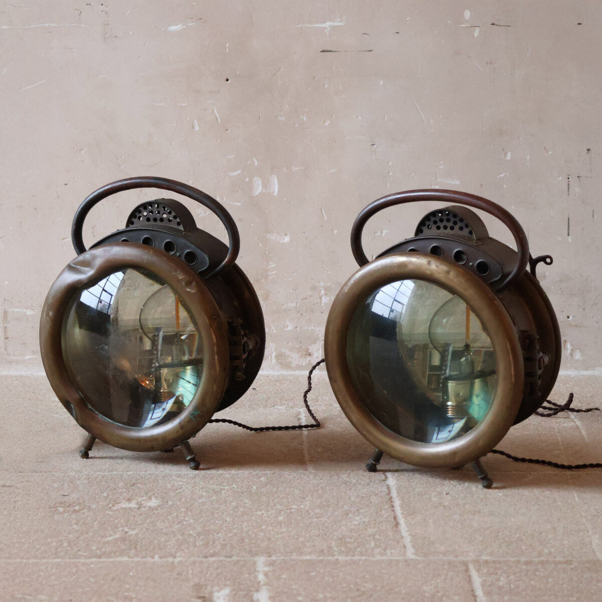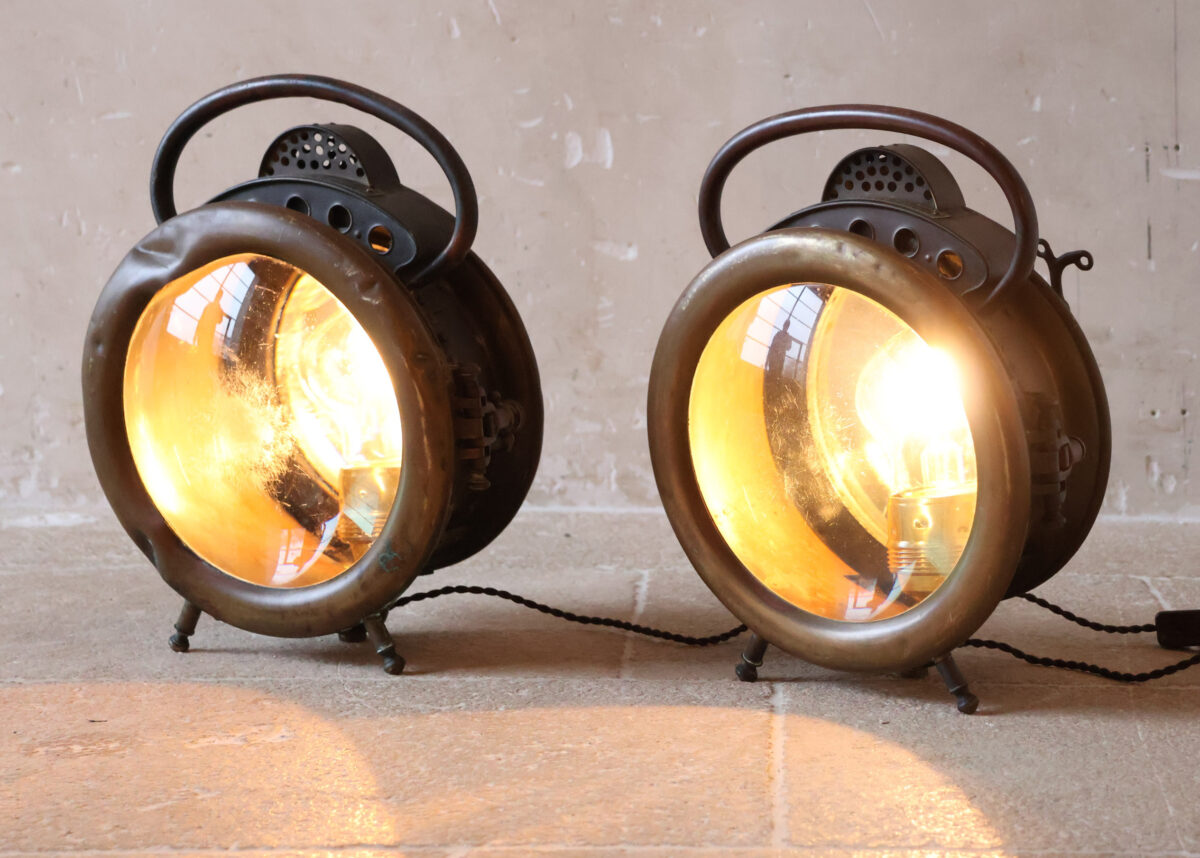 The lamps feature a robust, industrial design made of brass and dark metal. The front has a domed glass, with a mirrored reflector behind it. Each lamp is equipped with a carrying handle and stands on three small feet.