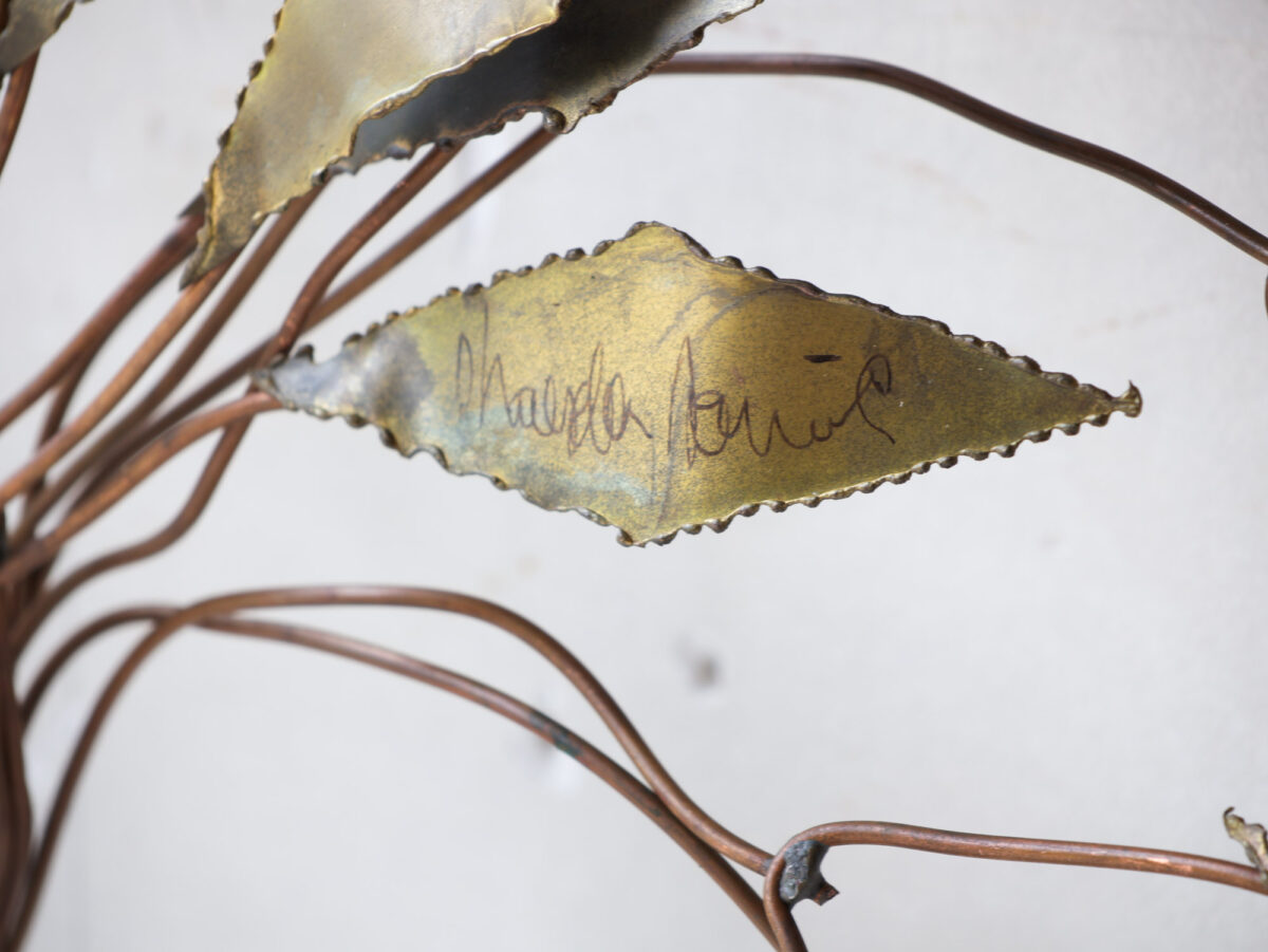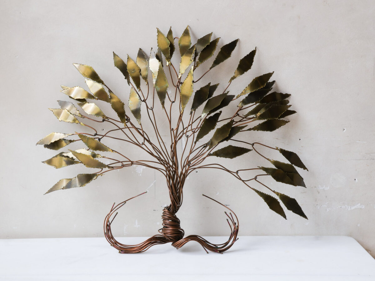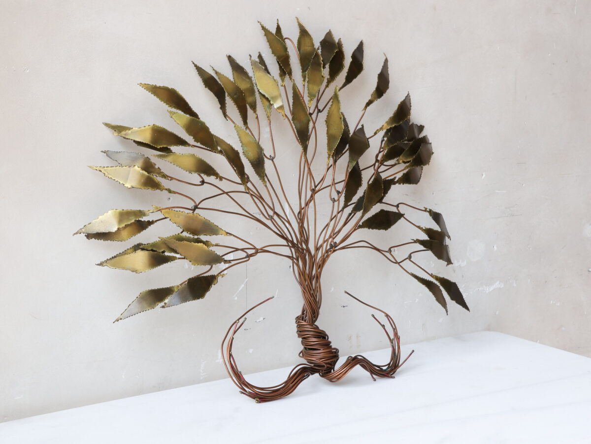 A special wall sculpture by the Belgian artist Daniel d’Haeseleer, from the 1970s, in the shape of a beautifully executed tree, made of gilded brass and copper. The artwork is signed by the artist. This wall decoration is not only an artistic addition to your wall, but also a testimony to the craftsmanship of Daniel d’Haeseleer. The combination of gold-plated brass and copper creates a warm, elegant look and adds a touch of retro-chic to your interior.