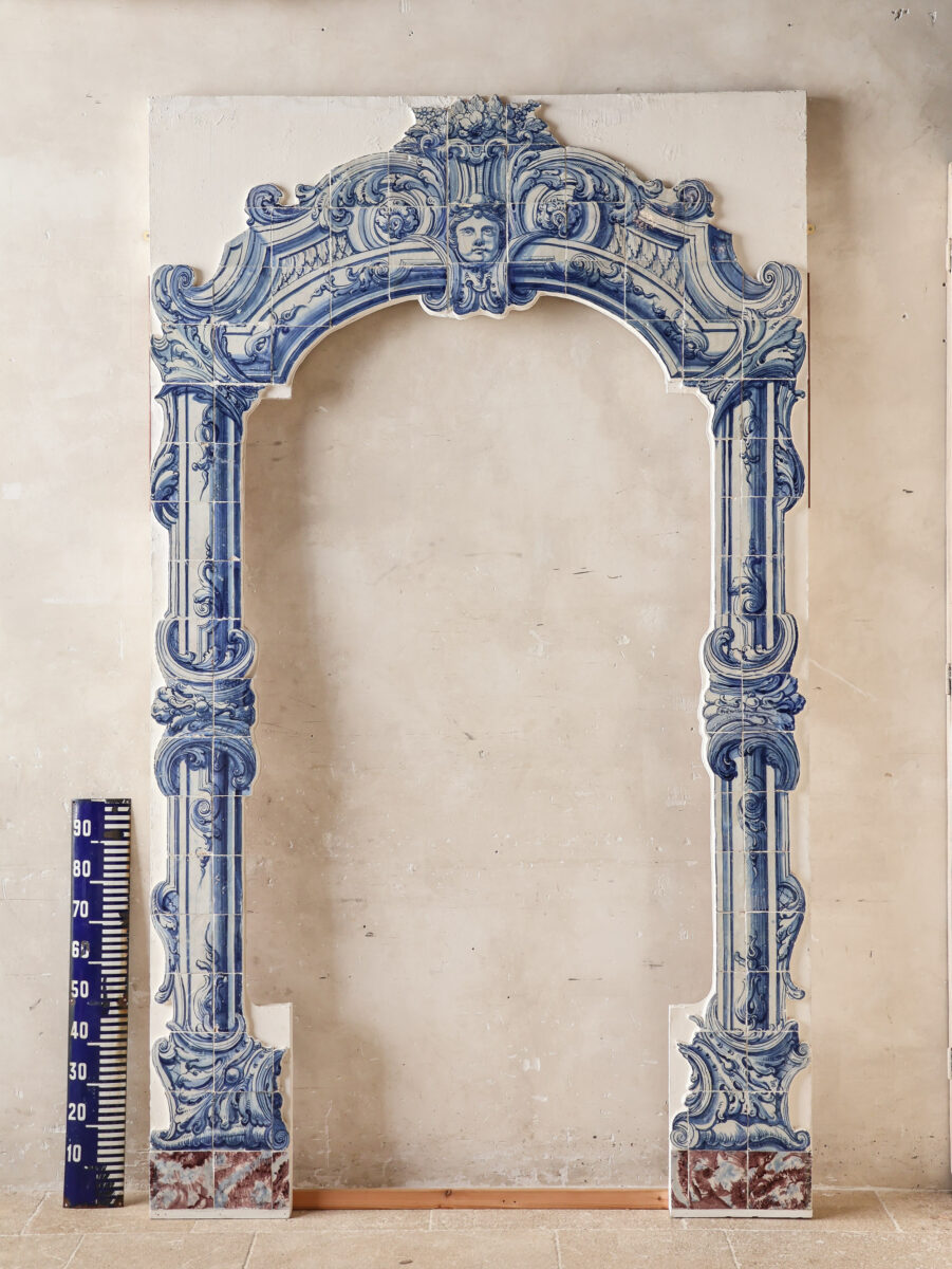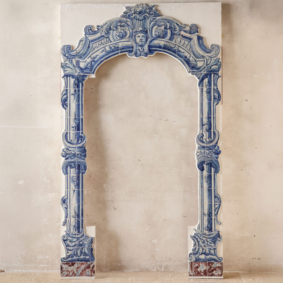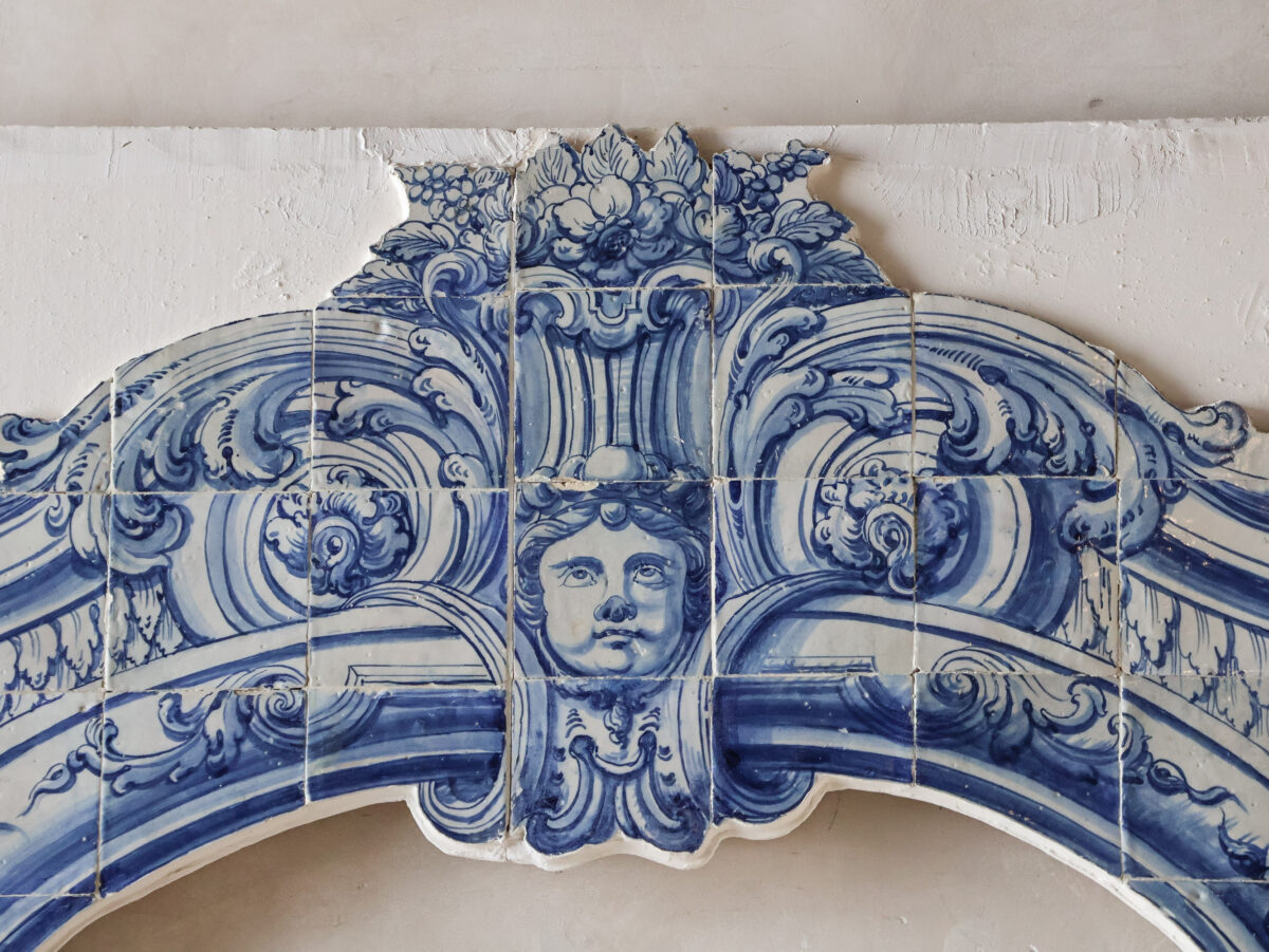 This monumental antique tile tableau forms an impressive architectural arch in classic blue-and-white tilework, executed in a rich Baroque style. The tableau is composed of carefully hand-painted tiles that together create an opulent composition of scrolling ornaments, acanthus leaves, and architectural pilasters. At the center of the upper arch sits a finely rendered cherub’s face, framed by elegant floral motifs.