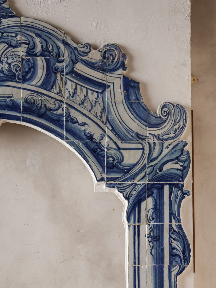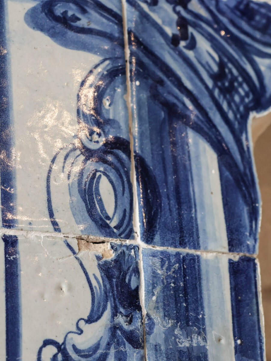 Monumental antique baroque tile tableau with architectural arch in blue and white