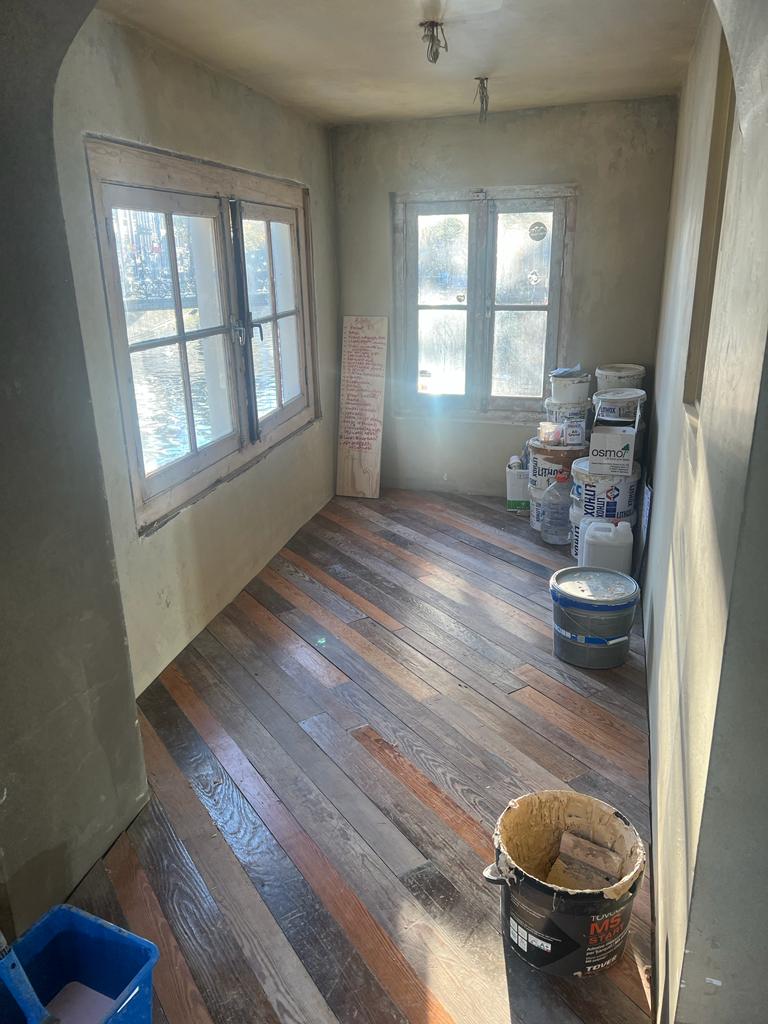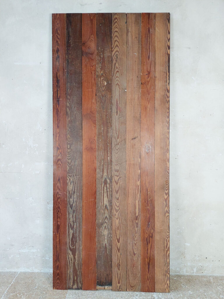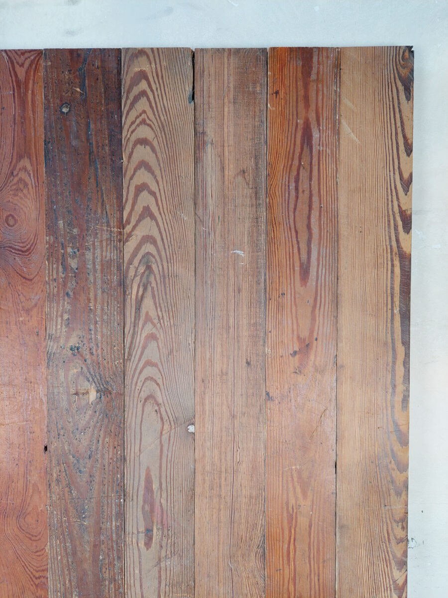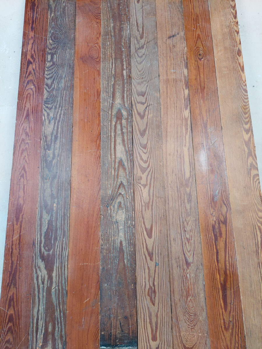 Old floor made of very hard pine, also called American pine or pitch pine. The floor has an old worn lacquer layer. Due to the narrow widths of the floorboards, we can call this a parquet floor. This floor comes in very long lengths, so there would be little material loss if you wanted to make it into a herringbone or Hungarian point.