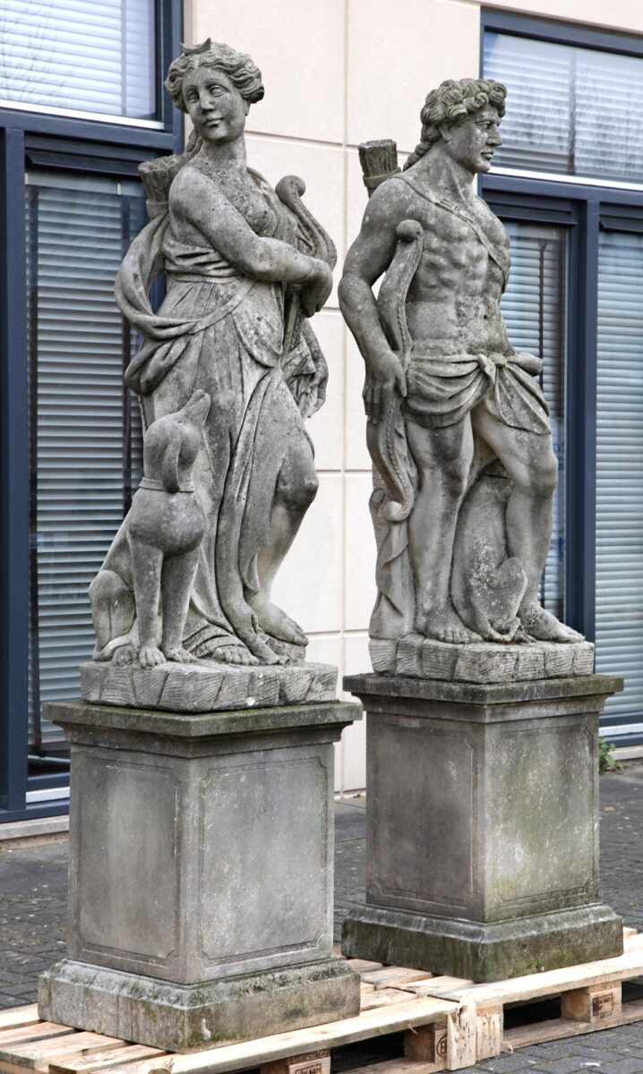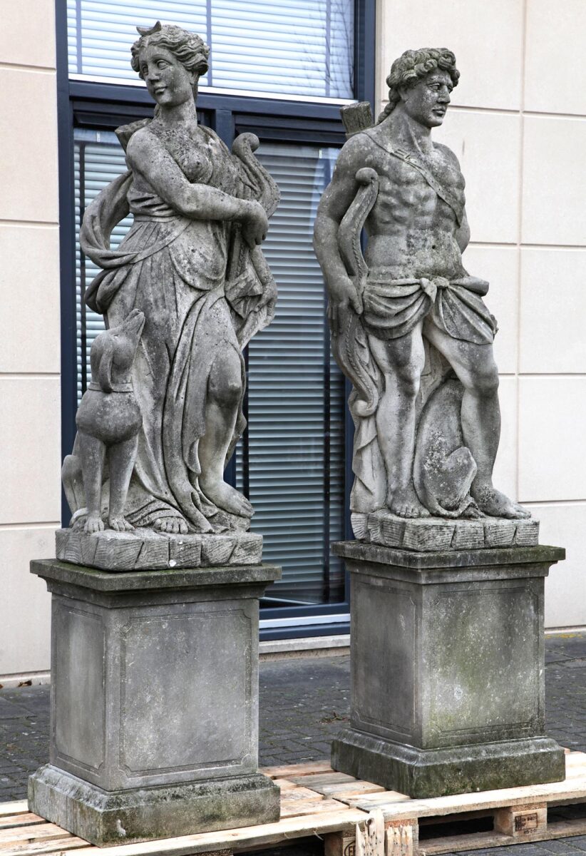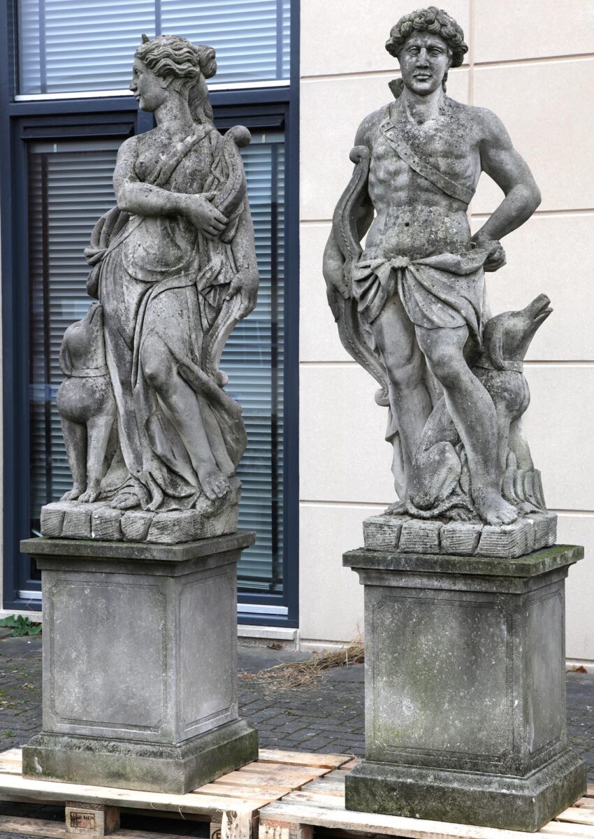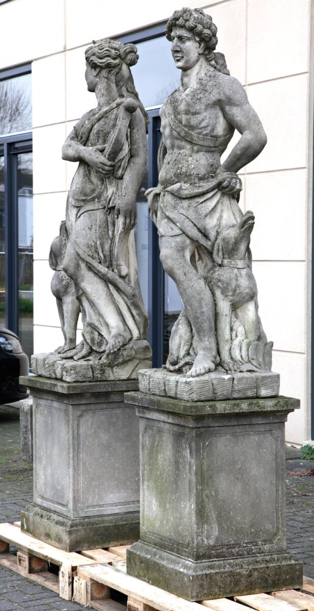 Pair of sculptural limestone figures from the second half of the 20th century. The Apollo and Diana figures are life-size and depict a contrasting scene: one nude, the other draped, both with their hunting equipment and accompanied by a hound at their side.