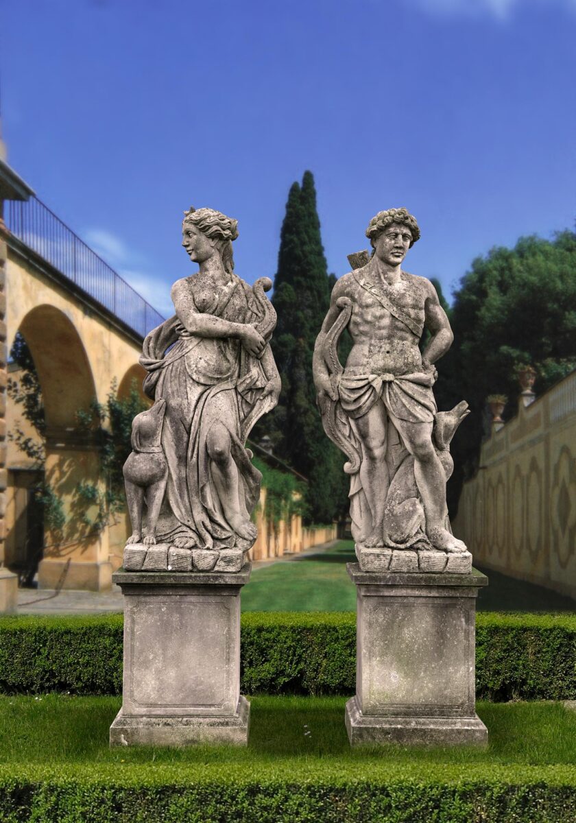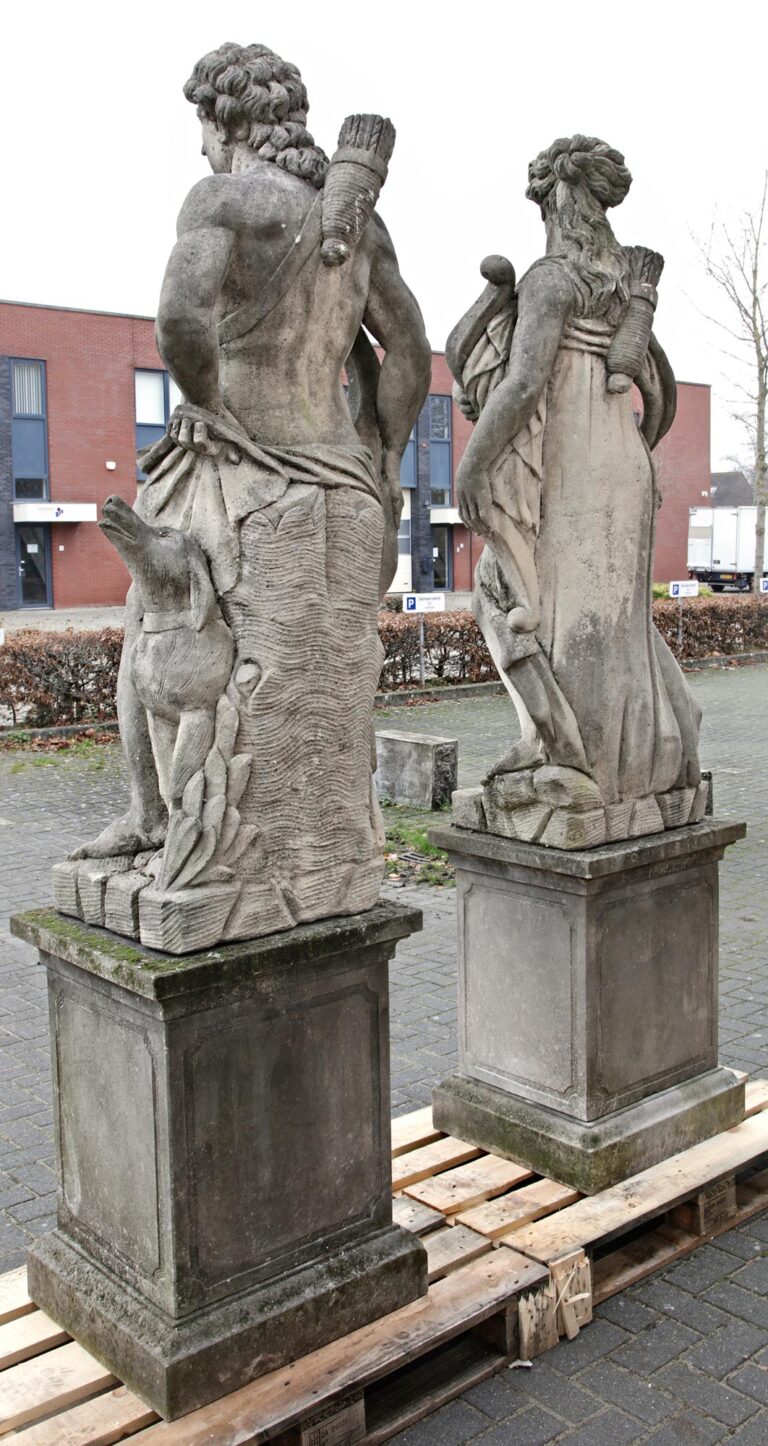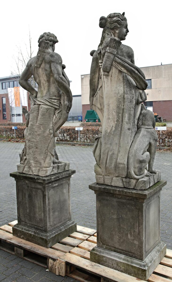 Pair of sculptural limestone figures from the second half of the 20th century. The Apollo and Diana figures are life-size and depict a contrasting scene: one nude, the other draped, both with their hunting equipment and accompanied by a hound at their side.