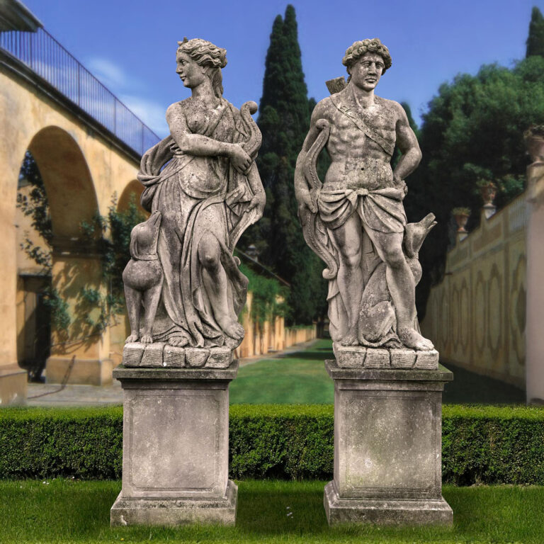 The figures stand on 80 cm-high pedestals (62 cm square), giving a total height of approximately 250 cm. With their detailed craftsmanship, classical theme, and impressive size, these sculptures make a striking centerpiece in a garden, entrance hall, or large interior. An exceptional example of 20th-century figurative limestone sculpture.