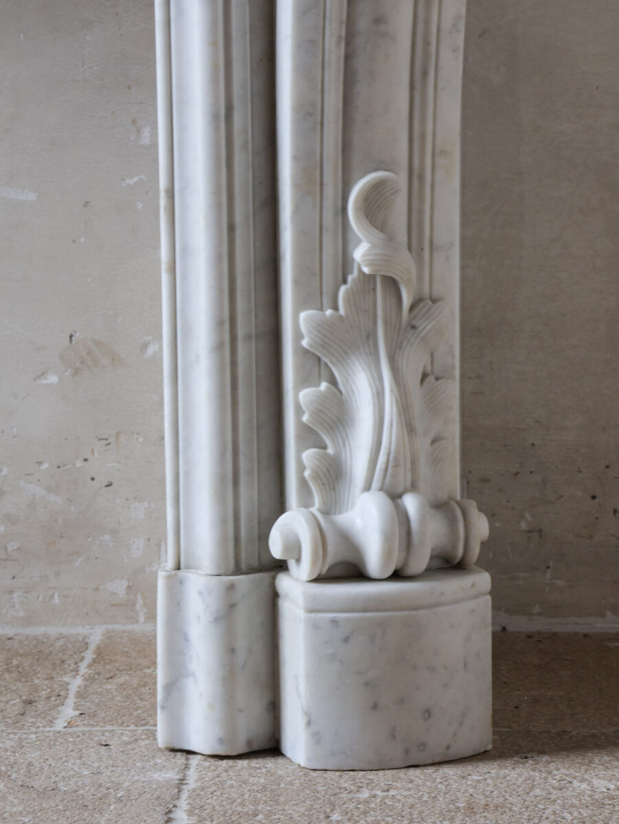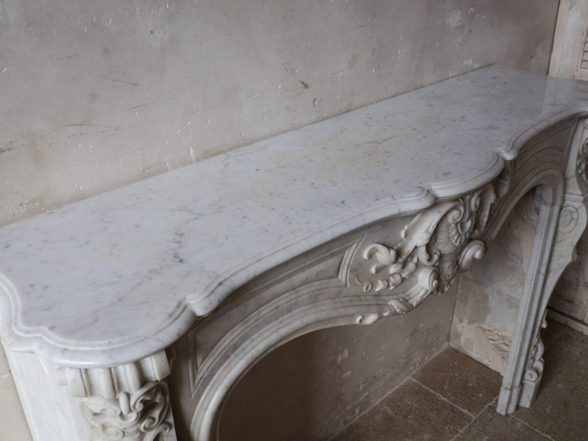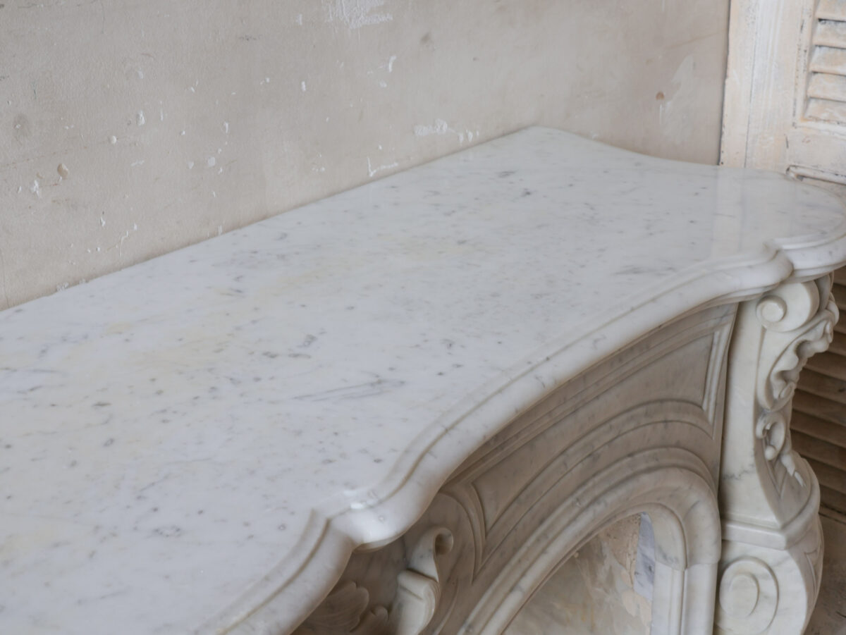 This antique 19th-century fireplace, crafted from refined Carrara marble, is a striking example of the elegant Louis XV style, also known as the Rococo style. The world-renowned white marble from Carrara is celebrated for its brightness and subtle grey veining, giving each piece a unique and timeless character.
