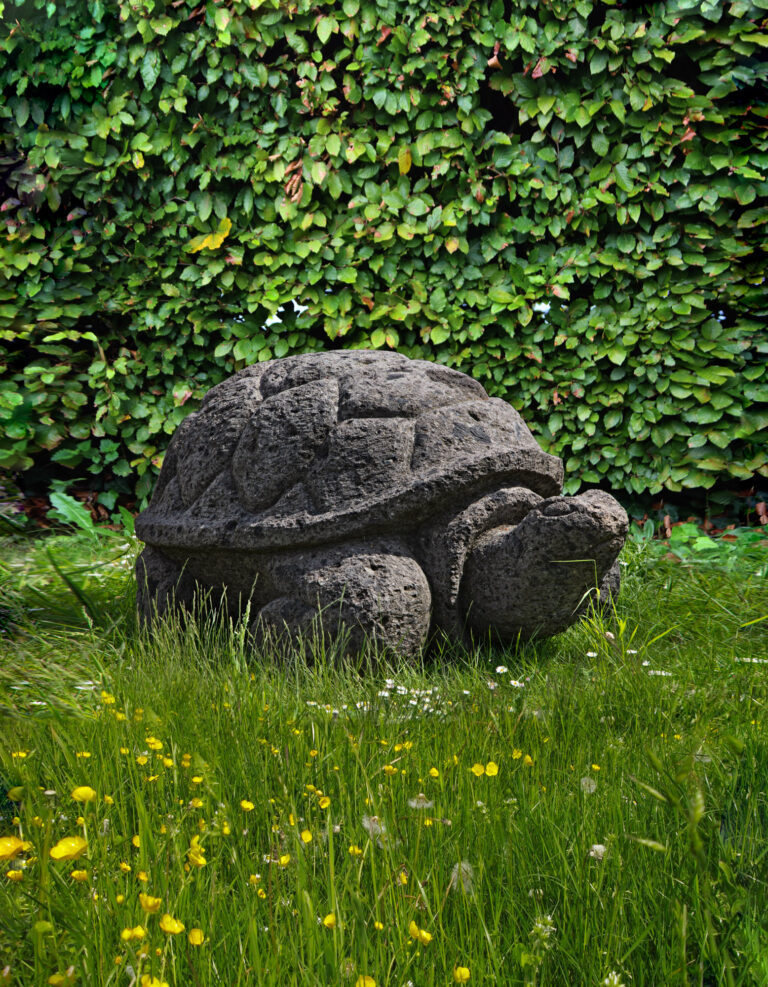 The natural texture and patina of the limestone give this object an authentic and timeless appeal, beautifully fitting into a green environment. This exceptional sculpture is an ideal focal point for any garden, patio, or pond edge, adding a touch of natural grandeur. Perfect for lovers of distinctive animal figures and high-quality garden art.
