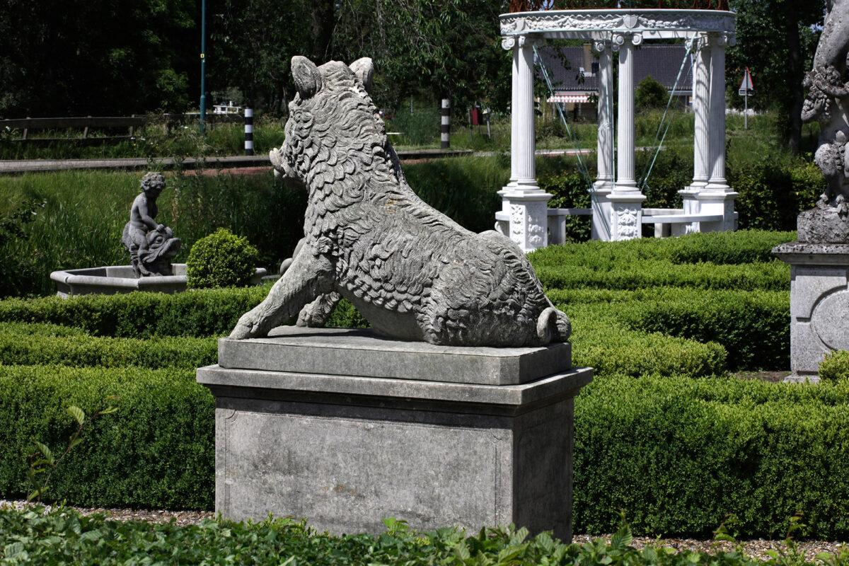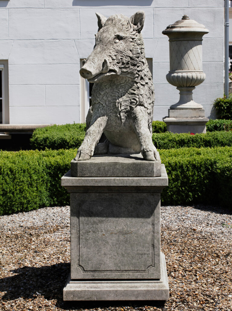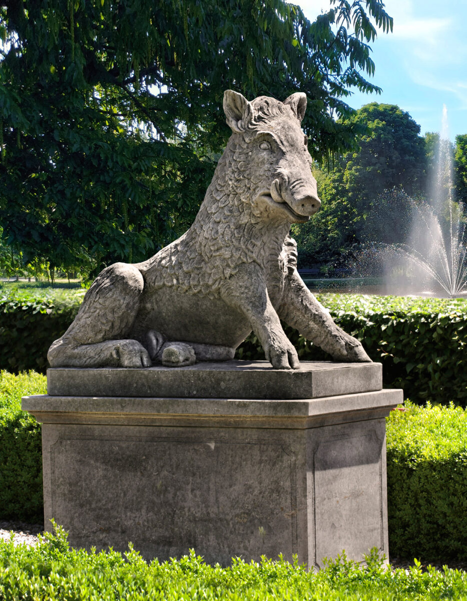 This impressive sculpted limestone model of the Calydonian wild boar dates from the second half of the 20th century. It is a detailed copy of the famous Calydonian boar located in the Uffizi Museum in Florence, which in turn is a copy of an ancient Greek original. According to Greek mythology, this boar was sent by the goddess Artemis. The beast is depicted seated on a rectangular rock-work base.