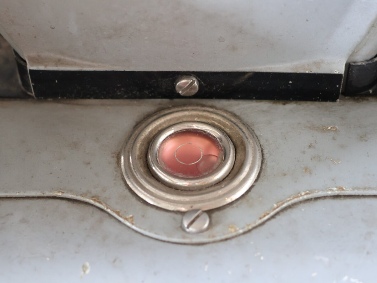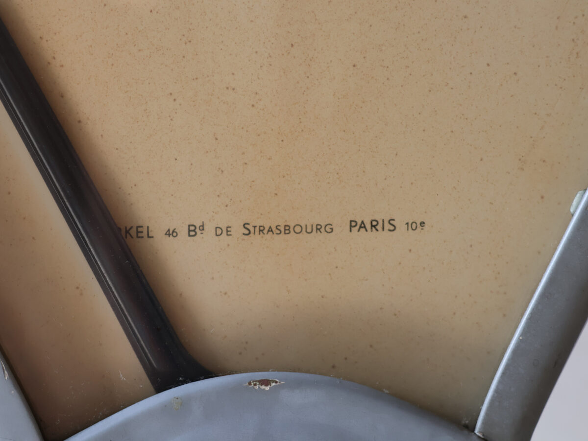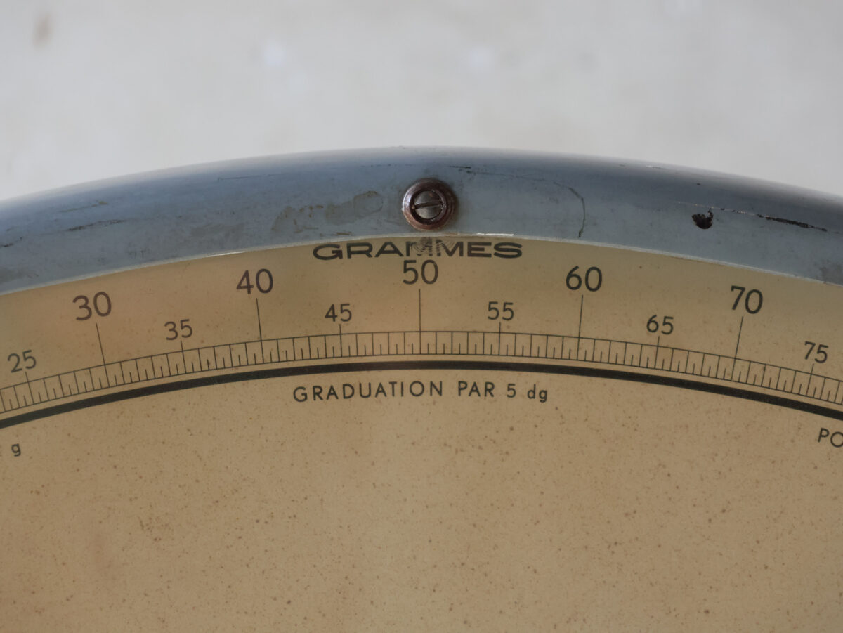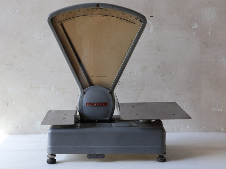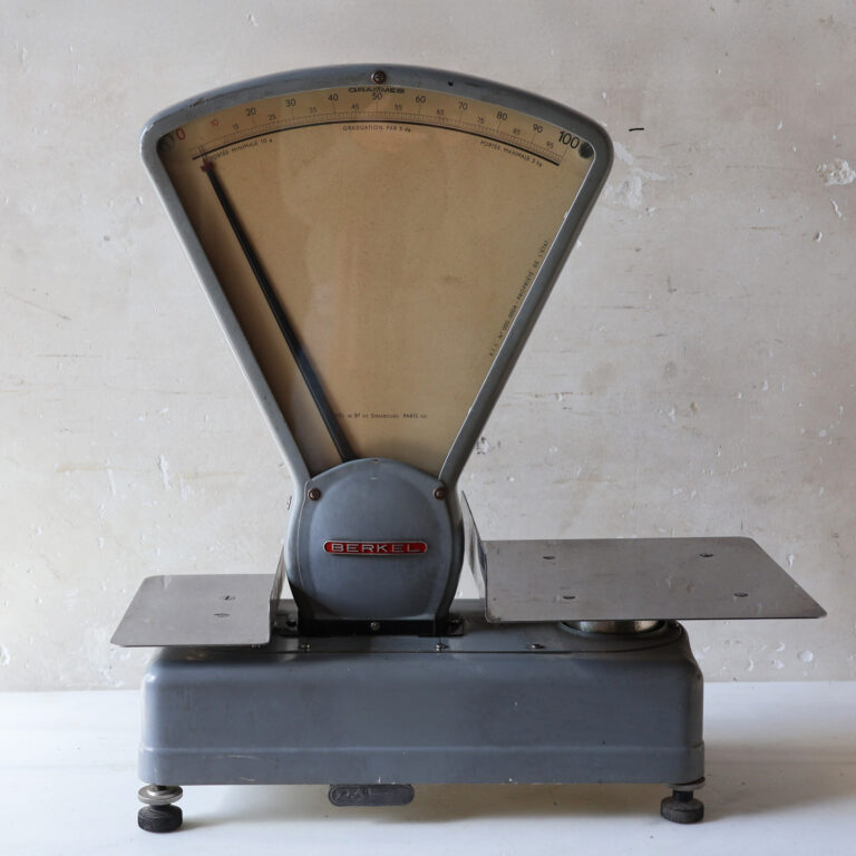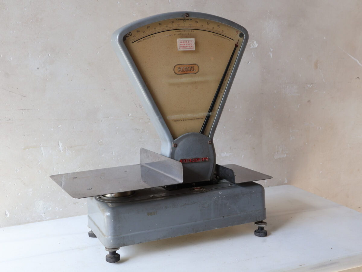 This grey enameled Berkel scale with stainless steel platforms originated from the Lyon factory. The instrument features a double-sided dial with a capacity up to 3 kg and includes a built-in spirit level. Original markings from the Boulevard de Strasbourg branch in Paris are still clearly visible on the glass.
