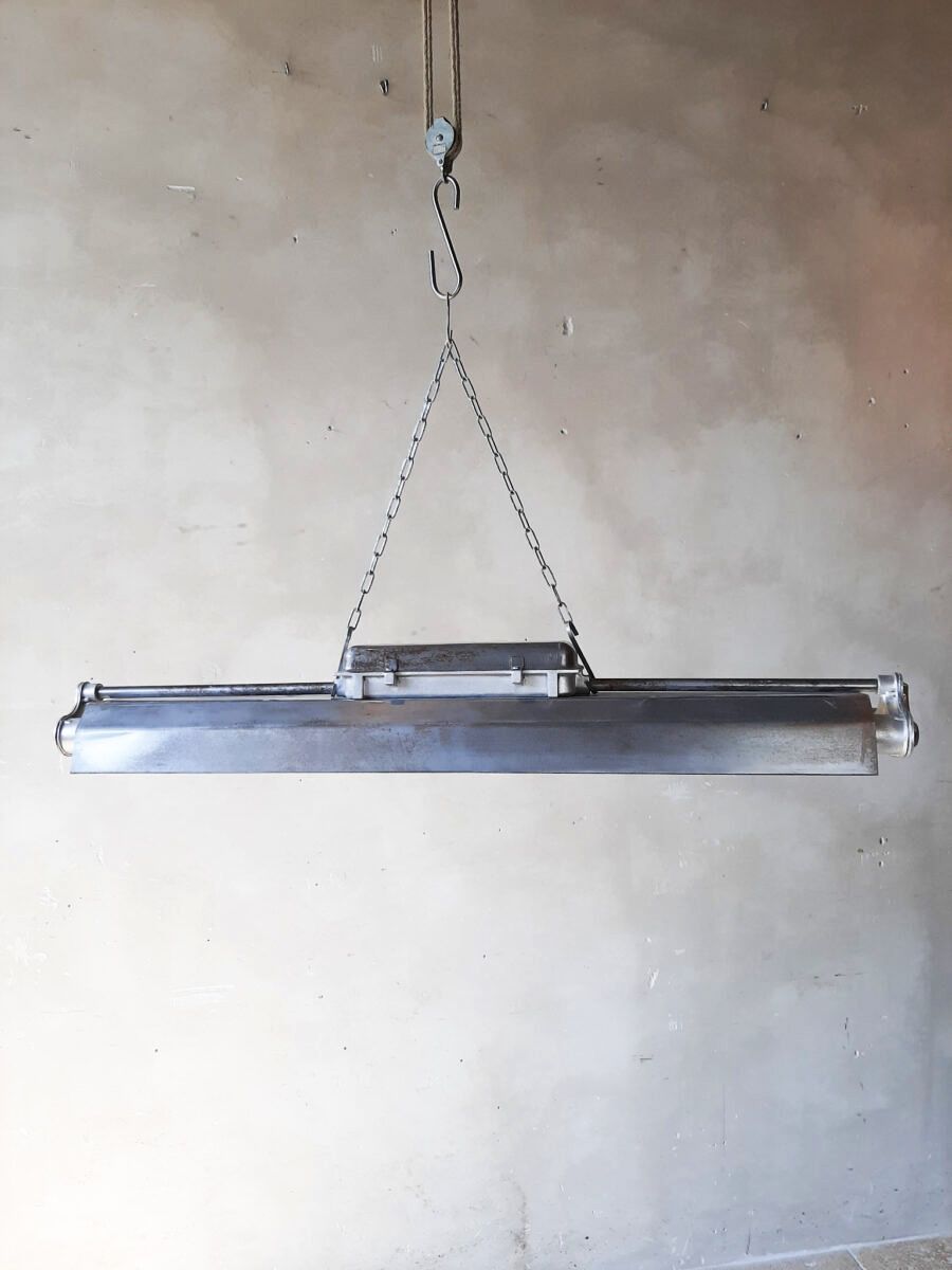 Original vintage industrial factory lights, expertly converted for use with E27 filament or LED bulbs. The metal fittings have been stripped and polished for an authentic, rugged aesthetic. Please note: The currently available units may slightly differ from the custom pendant lamp shown in the photographs.